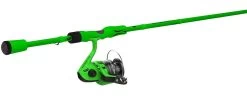 Designed for the angler looking to stand out from the crowd, the 13 Fishing Radioactive Pickle Spinning Combos blend performance fishing technology with eye-popping aesthetics for a great price. These striking neon green spinning combos elevate your chances at success on the water while letting everyone else at the lake know you mean business. The Radioactive Pickle Combos deliver high performance marks across the board thanks to a durable and lightweight PVG36T graphite blank construction. The inclusion of an Evolve soft touch custom reel seat and tangle free stainless steel guides with zirconia inserts ensure maximum comfort with minimal setbacks from botched line management. The included Kalon Spinning Reel offers smooth, reliable performance thanks to a precision CNC cut Z Cast Drive Gear, Glide Oscillation System, and 6 ball bearing construction. Instant Stop Anti-Reverse and 14lbs of fish stopping maximum drag will help you put the brakes on biggest bass in the lake.