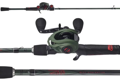 The Zata Baitcasting Reel is built around a lightweight yet highly rigid graphite frame and sideplate, and is equipped with an ergonomically bent handle and drag star to provide a streamlined and easily palmable package. Equipped with Abu Garcia’s Carbon Matrix drag system, the Zata is capable of stopping any bass dead in its tracks with up to 20 lbs of smooth peeling drag pressure. At the Zata’s core is a Duragear brass main gear that provides a silky smooth retrieve that will stand the test of time. With a highly adjustable Infini-brake magnetic braking system, anglers can expect optimal casting performance with a wide variety of baits in all conditions. Finally, the reel’s one-of-a-kind olive drab finish with black and red accents is matched by the rod to give the combo a signature styling that any outdoorsman can appreciate.