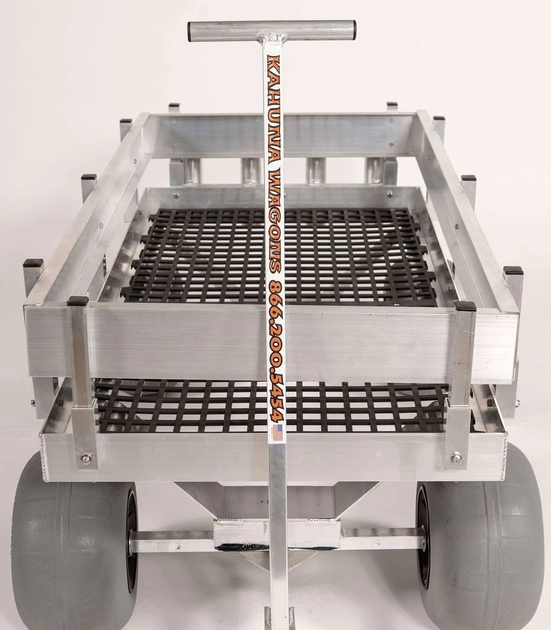 The Alumacart Big Kahuna Beach Wagon w/UV Decking features a UV protected polypropylene deck that allows for sand and water to easily fall through the wagon bed. This wagon features reinforced and raised undercarriages, aluminum four-rod holder bolted to the aluminum deck with stainless steel hardware, aluminum wagon walls to protect your cargo from falling out of the wagon, (4) 11.8” low PSI balloon tires, and a pull handle.