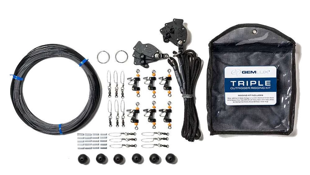 The Gemlux Triple Outrigger Kit will rig 1 pair of outriggers up to 22 ft. The kit is packaged in a durable marine mesh bag.