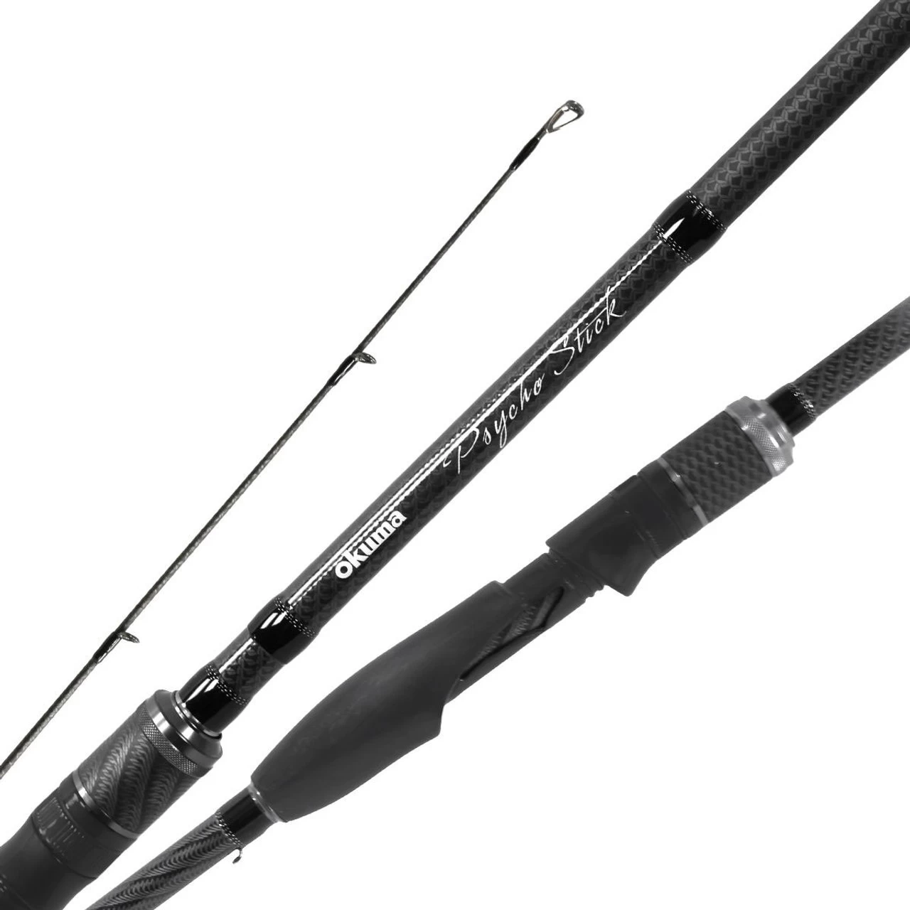 Okuma Psycho Stick Spinning Rods are built with a light and responsive 46-ton, low resin carbon rod blank, Fuji KW-concept angled guide frames, Fuji Sic guide inserts, and a rear split grip with SeaGuide carbon spinning reel seat and carbon screw down.