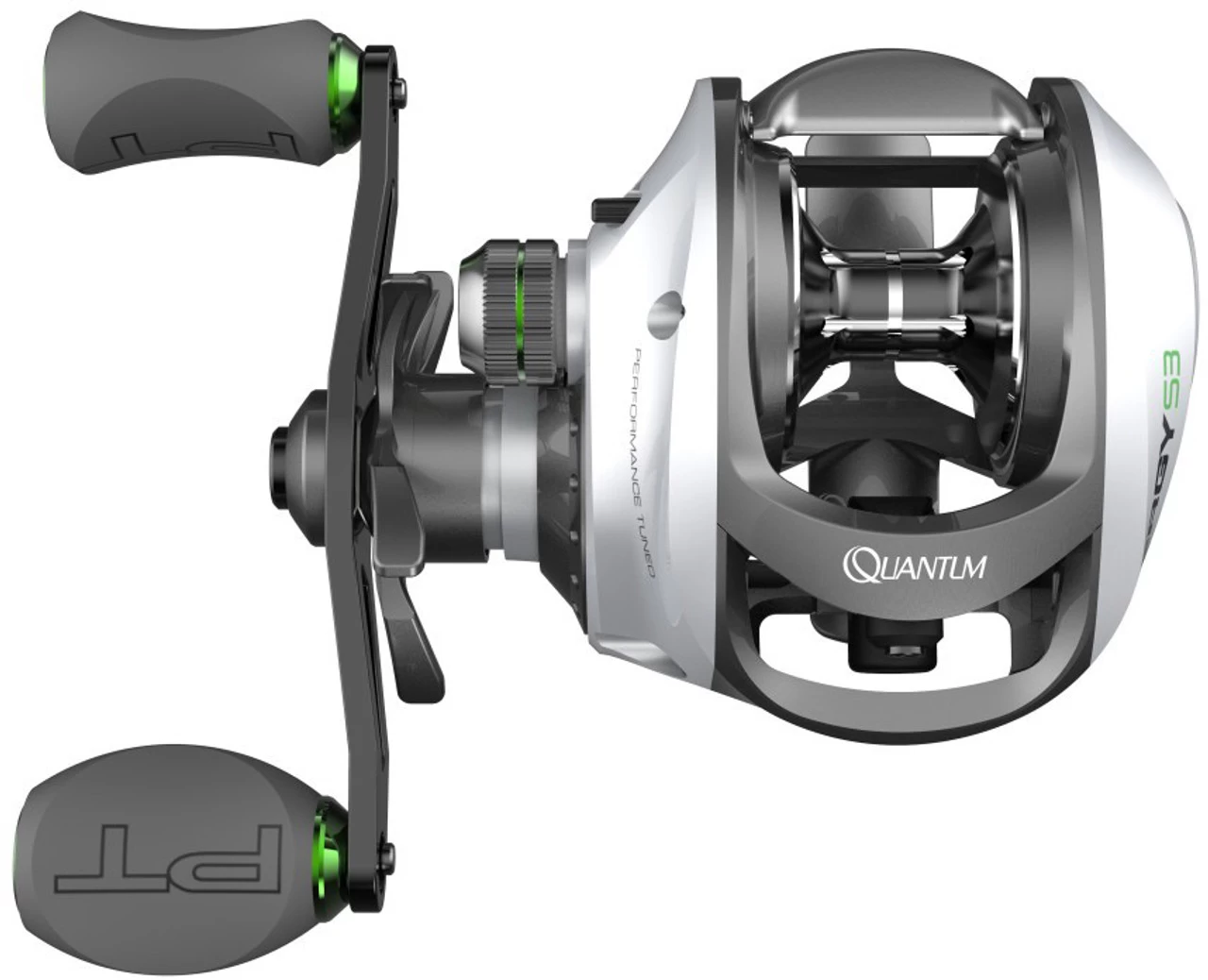 Redesigned for 2019, the Quantum Energy S3 PT Baitcasting Reels utilize Quantum’s Performance Tuned technologies to provide tournament level performance. Built around a one piece aluminum frame, the Energy S3 PT has a rugged construction yet is incredibly lightweight. The implementation of Quantum’s PT ACS 3.0 centrifugal cast control system allows these baitcasters to excel at throwing a wide variety of baits, from weightless soft plastics to heavy punching rigs and everything in between. This cast control system allows you to dial in the exact amount of braking force without removing the side cover that’s required on other reels. Fisherman of all varieties will be happy to put the Energy’s Flippin’ Switch feature to work. The Flippin’ Switch increases ease-of-use while flipping and pitching and is a very popular feature with anglers who use the low profile reels for vertical jigging techniques in areas were depth can suddenly change. Rounding out the design of the Energy S3 PT is Quantum’s signature PT Bearings and PT Gear Design that combine for unmatched smoothness and operability.