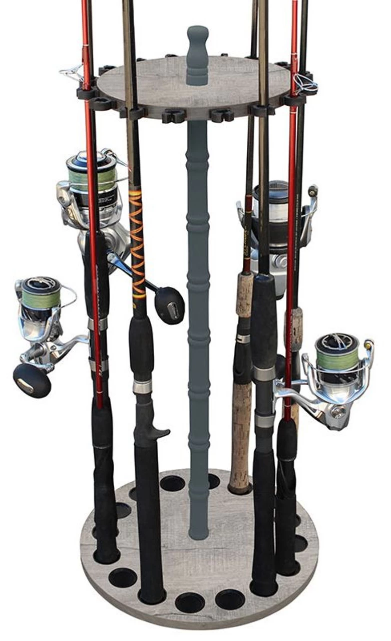 The Rush Creek Creations 16 Round Fishing Rod Storage Floor Rack is a unique one of a kind rod rack. Caps on the base plate are designed to pool water that may be on your rod or reel. Featuring a heavy duty 38mm steel powder coated center post, adding to the durability of this rod rack. The top plate has 16 soft freshwater rod clips that are adjustable for any rod taper. This fishing rod rack is easy to assemble as no tools are required.