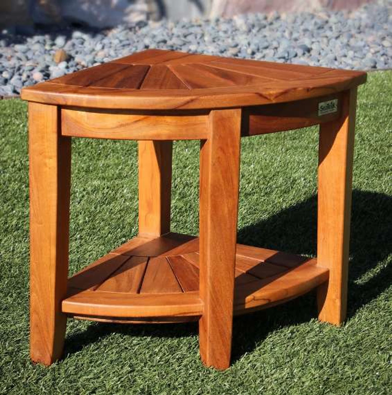 SeaTeak 60025 Shower and Spa Corner Seat with an Oiled Finish is a solid teak accent piece that can be used as a corner seat or side table in your bathroom or shower.