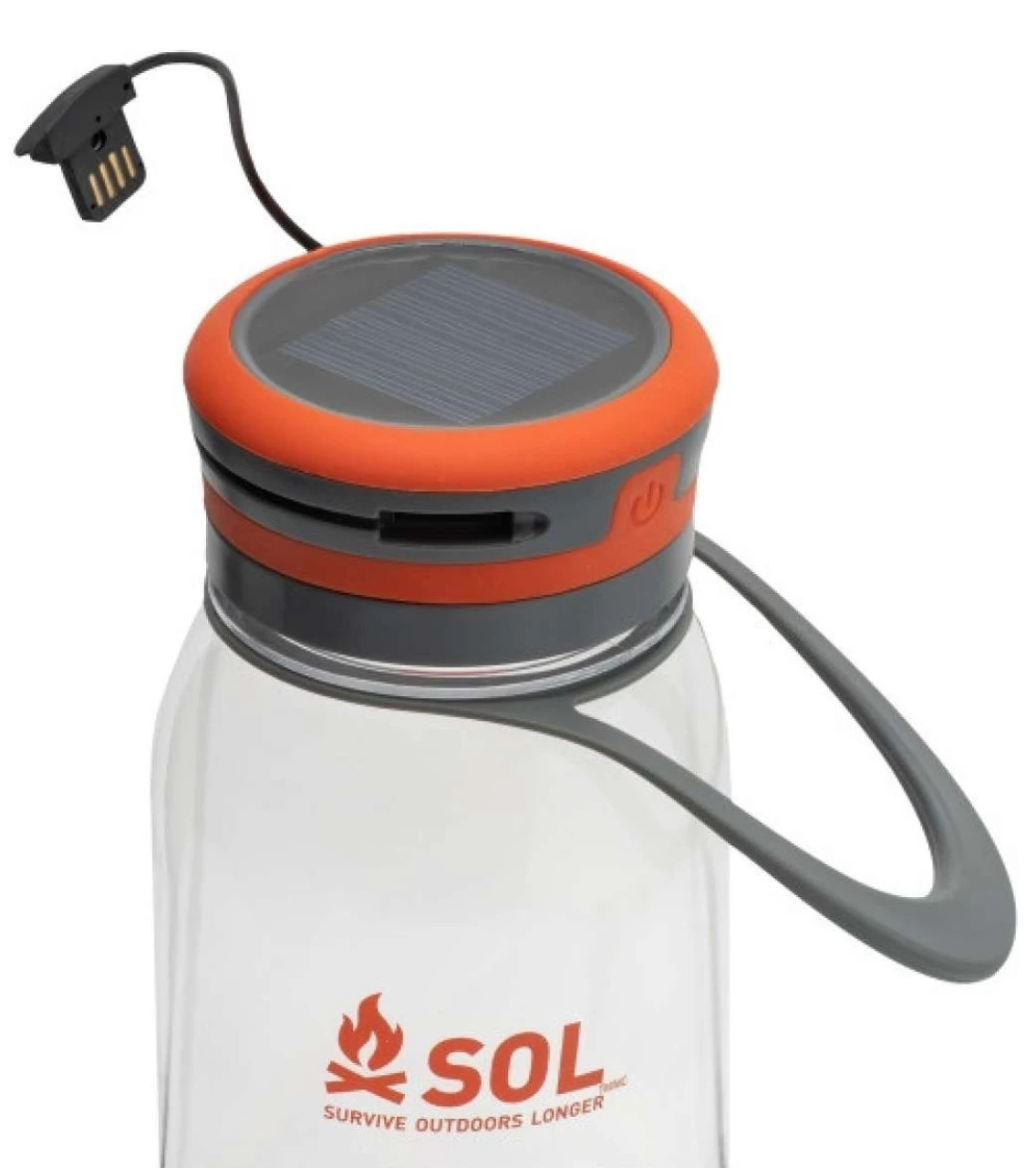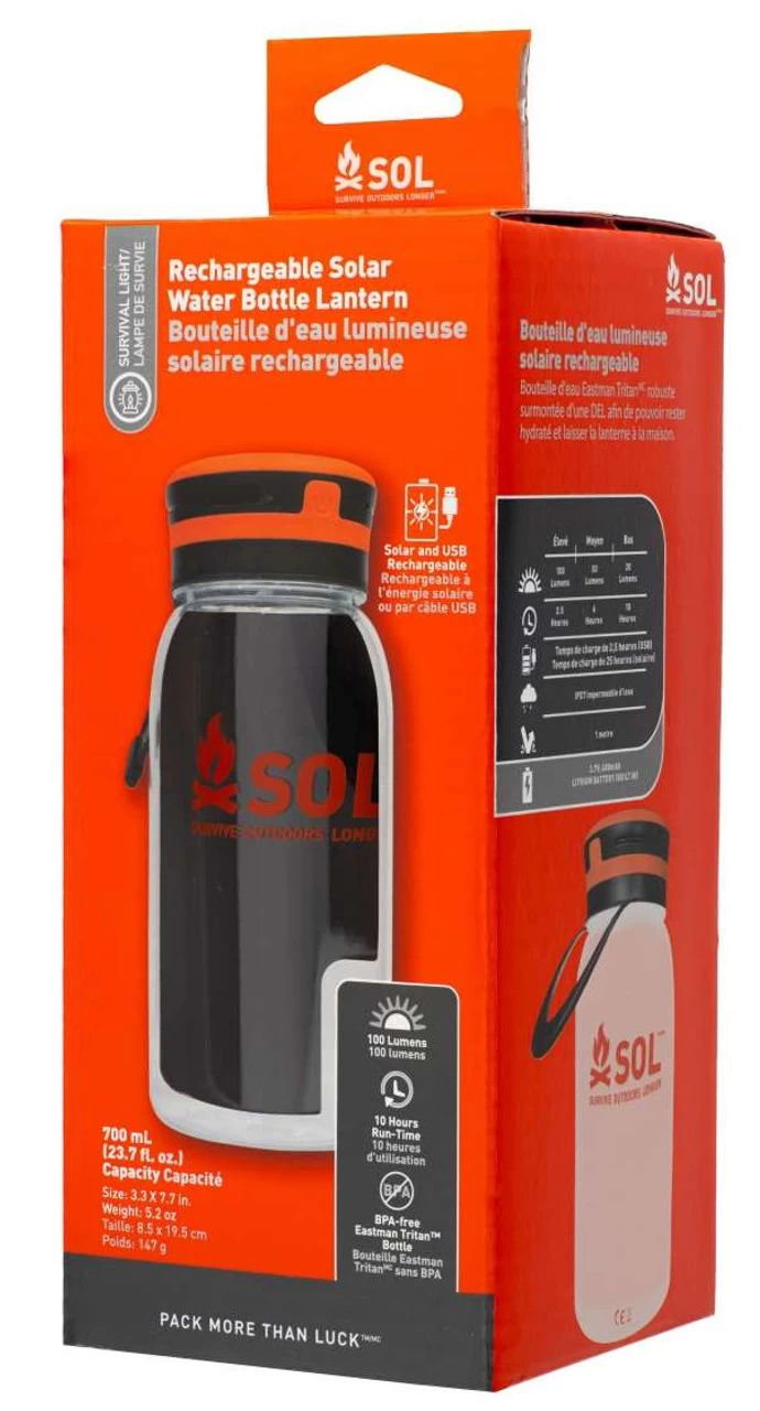 The Survive Outdoors Longer Venture Solar Water Bottle Lantern can light up the campsite picnic table with 3 lighting modes ranging from 20-100 lumens and up to 10 hours run time. Carry around the campsite by the durable and comfortable handle attached to the cap. Recharge via the integrated USB cord in 2 hours or on the go with the solar panel on the top of the cap in 25 hours. When cleaning, simply remove the cap and place the bottle in the dishwasher. Stay hydrated and pack sunlight wherever you go with the innovative 2-in-1 SOL Rechargeable Solar Water Bottle Lantern.