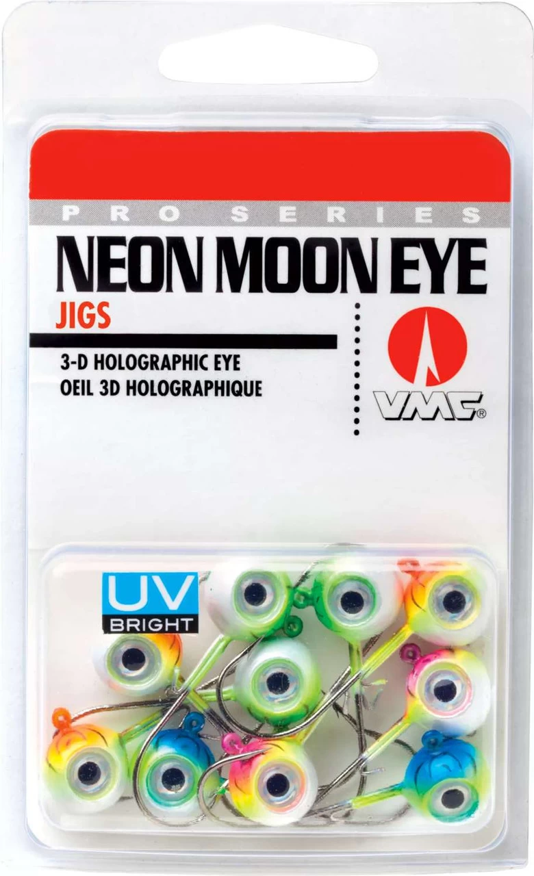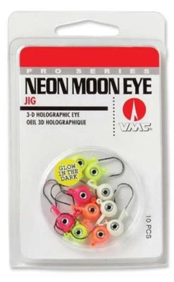 The VMC Neon Moon Eye Jig Kit feature 3-D holographic eyes that create the illusion of a wider profile while adding realism. The Neon Moon Eye Jig is an upgraded version of the traditional aspirin shaped heads to provide added control. These are assembled using a VMC Premium high carbon steel hook with top of the line black nickel finish. The wide range of colors guarantee you to catch more fish in all water conditions.